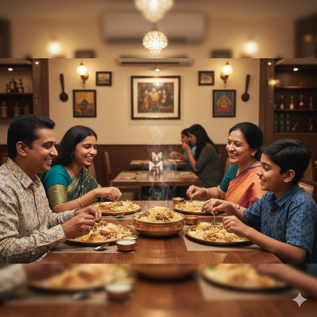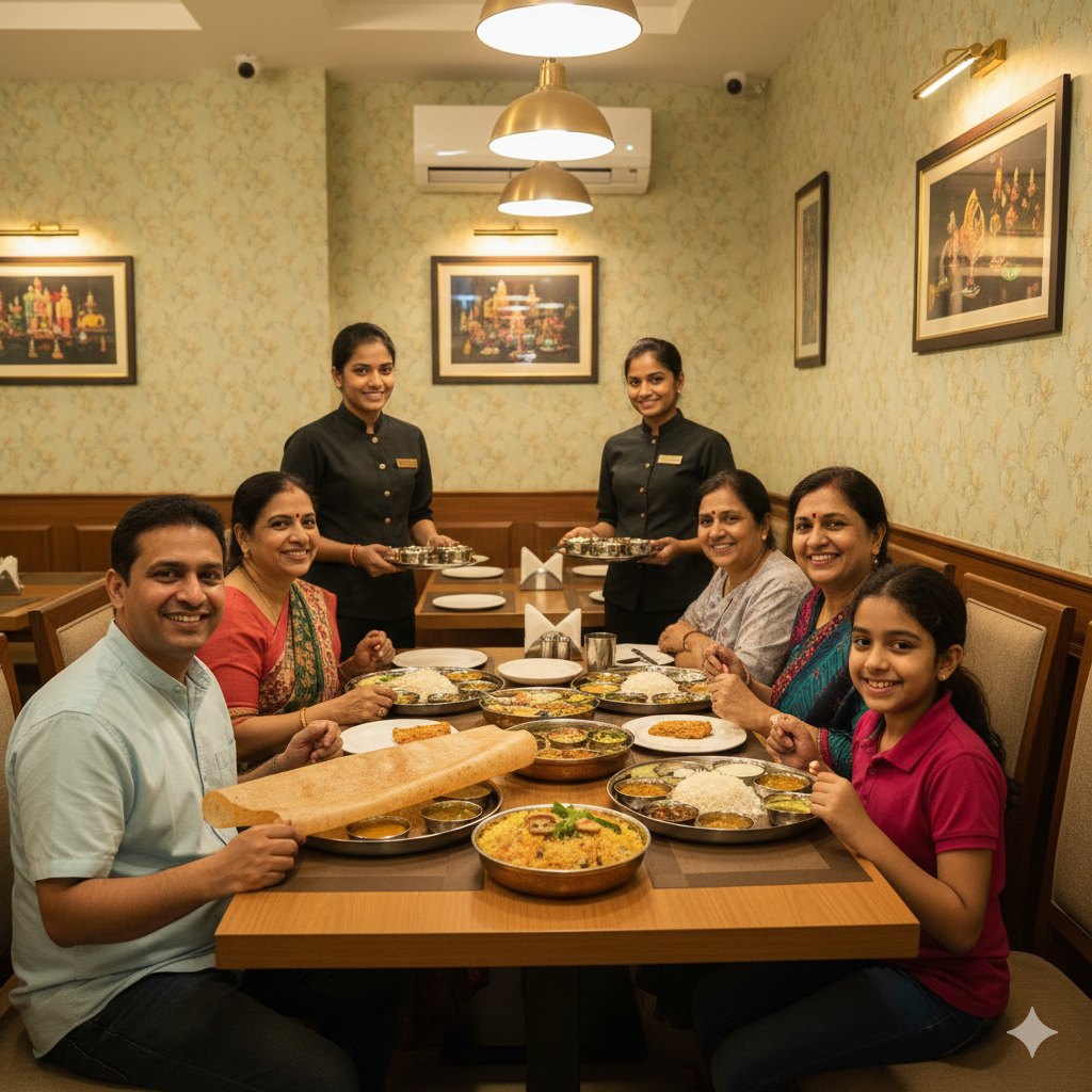 Family enjoying authentic South Indian food at Bhavy’s Kitchen – Uppal